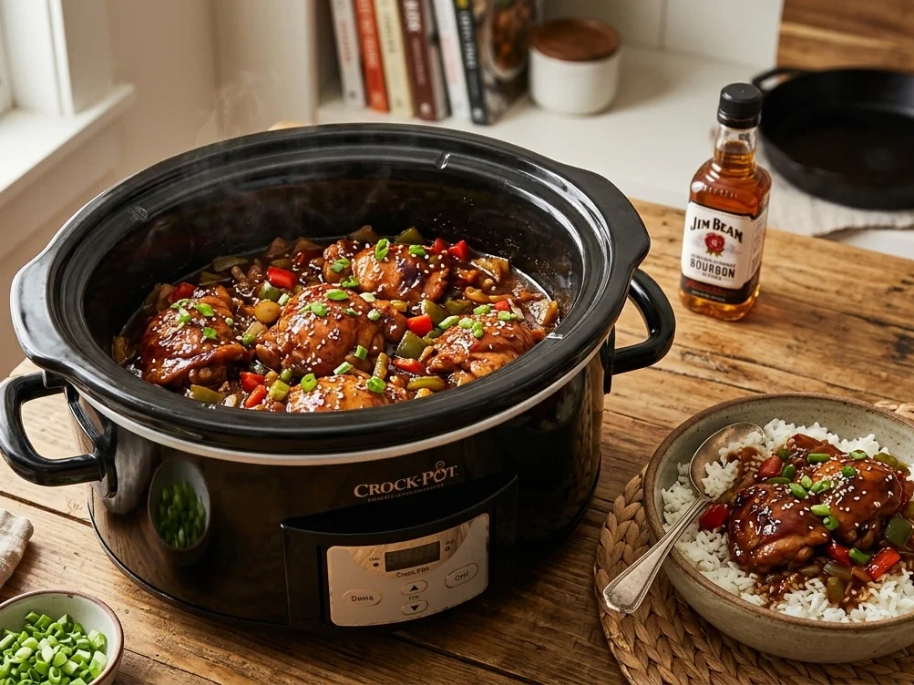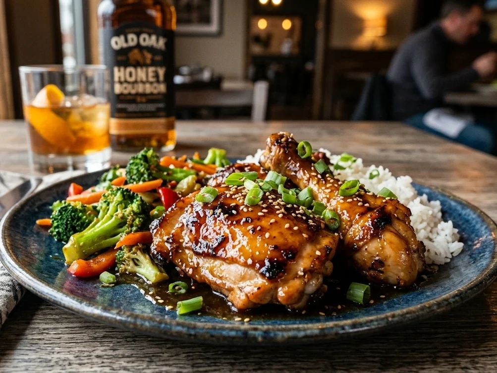 Can I make this bourbon chicken recipe without alcohol? Yes — replace the bourbon with ½ cup apple juice, 1 tsp vanilla extract, and 1 tsp liquid smoke. The result is impressively close to the original.